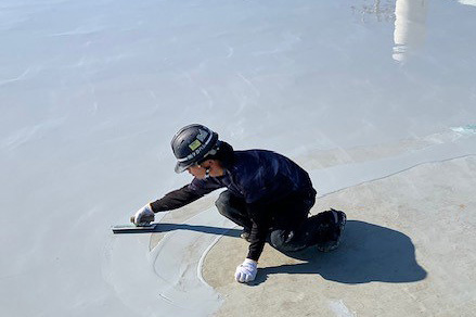 最も特徴的な工法であり、当社の強みでもある「超速硬化ウレタンスプレー工法」は、2液反応型のウレタンを高圧でスプレーし、わずか数秒で硬化することで、工期の短縮・高い密着性・優れた防水性能を実現します。